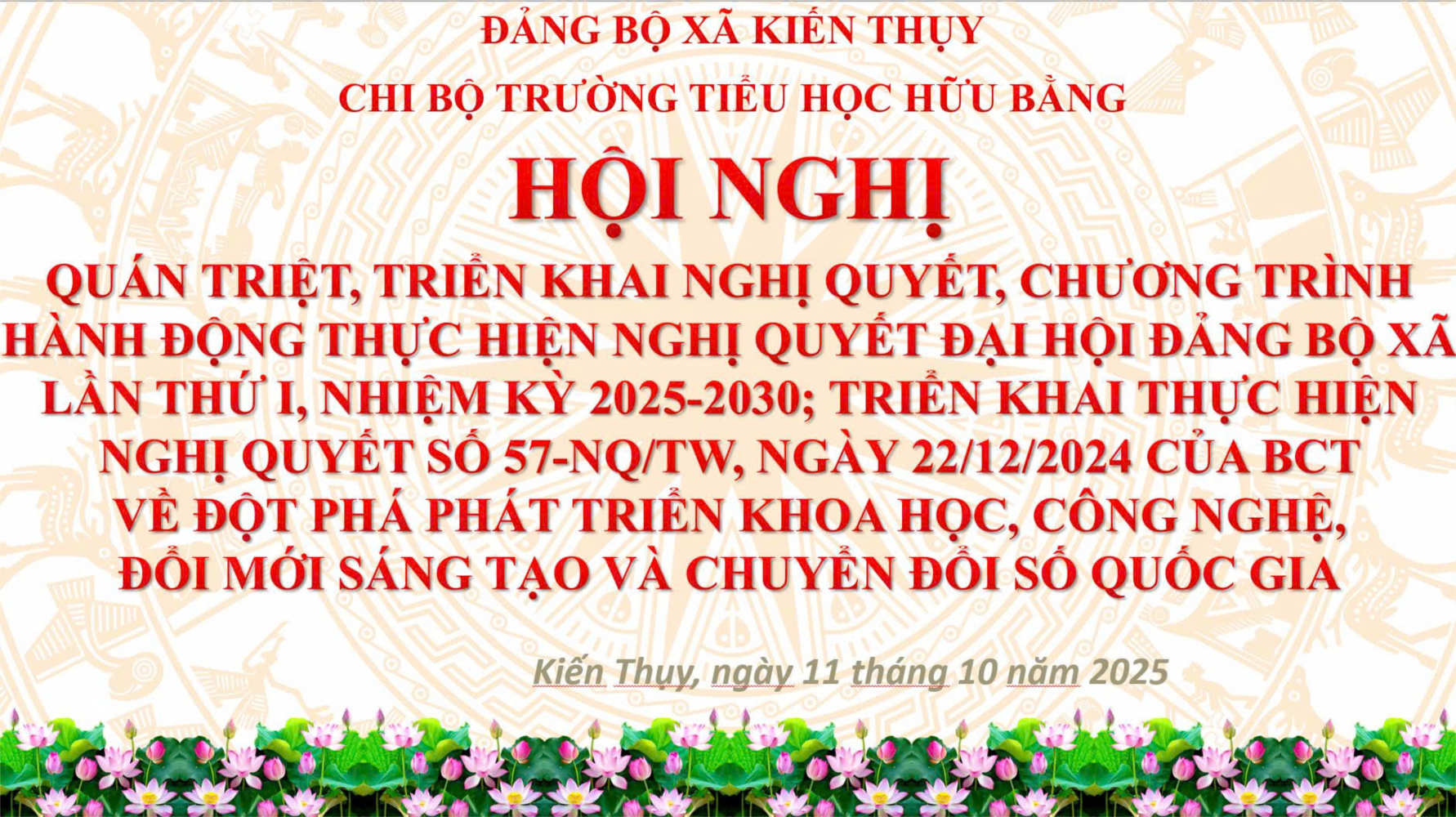 Cũng trong Sáng ngày 11/10/2025, Chi bộ trường Tiểu học Hữu Bằng tổ chức Hội nghị quán triệt, triển khai Nghị quyết, Chương trình hành động thực hiện Nghị quyết Đại hội Đảng bộ xã lần thứ I, nhiệm kỳ 2025–2030; đồng thời triển khai Nghị quyết số 57-NQ/TW ngày 22/12/2024 của Bộ Chính trị về đột phá phát triển khoa học, công nghệ, đổi mới sáng tạo và chuyển đổi số quốc gia.